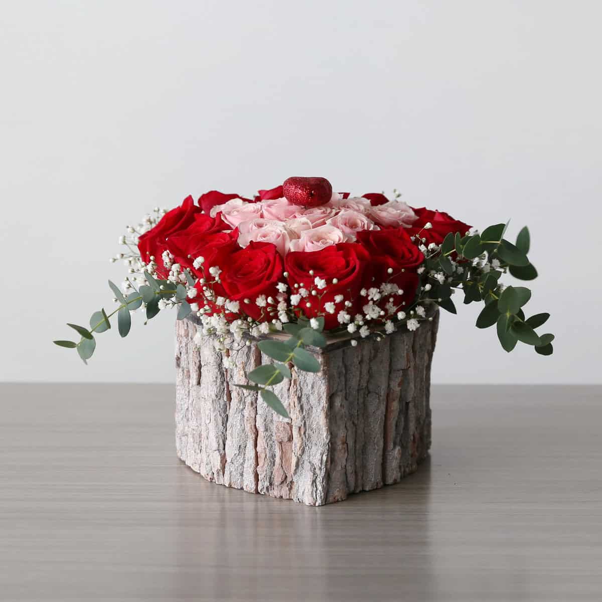Featuring a heart-shaped composition of premium red and soft pink roses, accented with delicate baby’s breath and eucalyptus, this arrangement is beautifully presented in a rustic wooden container.