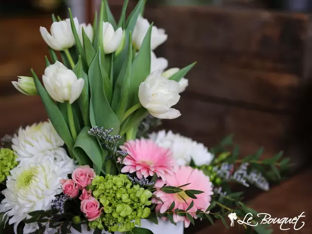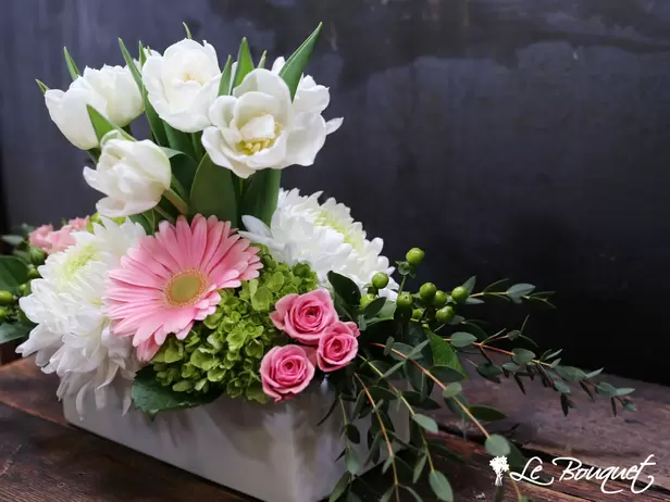 Named after the shop owner's mother, Anna, this arrangement is our signature Mother's day piece for 2019. Artfully arranged in a white ceramic container, white tulips, green hydrangea, pink gerberas, and white commercial mums fit neatly together to create this fresh garden look.
