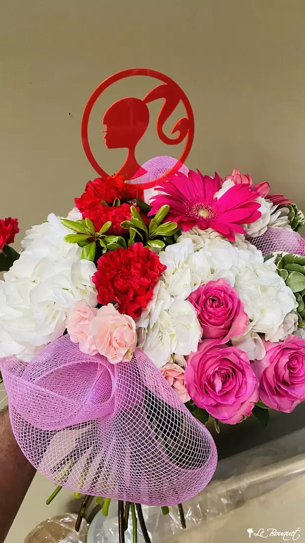 Embrace the magic of pink and white petals, a Barbie pick, and chic pink wrapping. The ultimate treat for your inner Barbie!