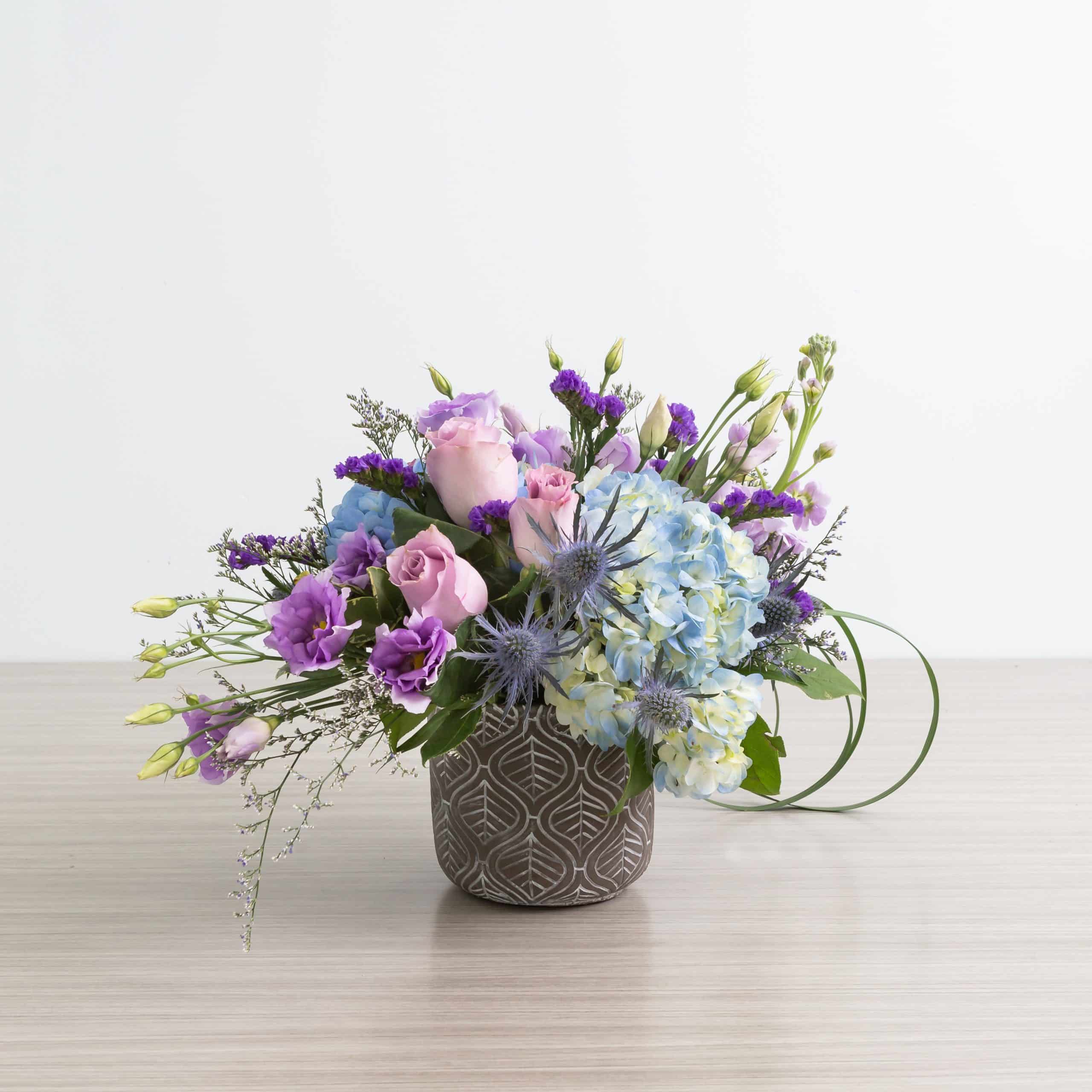 Introducing Blue Moon, a charming mix of blue, purple, and pink blooms artfully arranged in a vase. The soothing blue hygrengeas, elegant purple snap dragons, and soft pink roses come together to create a balanced and delightful composition.
