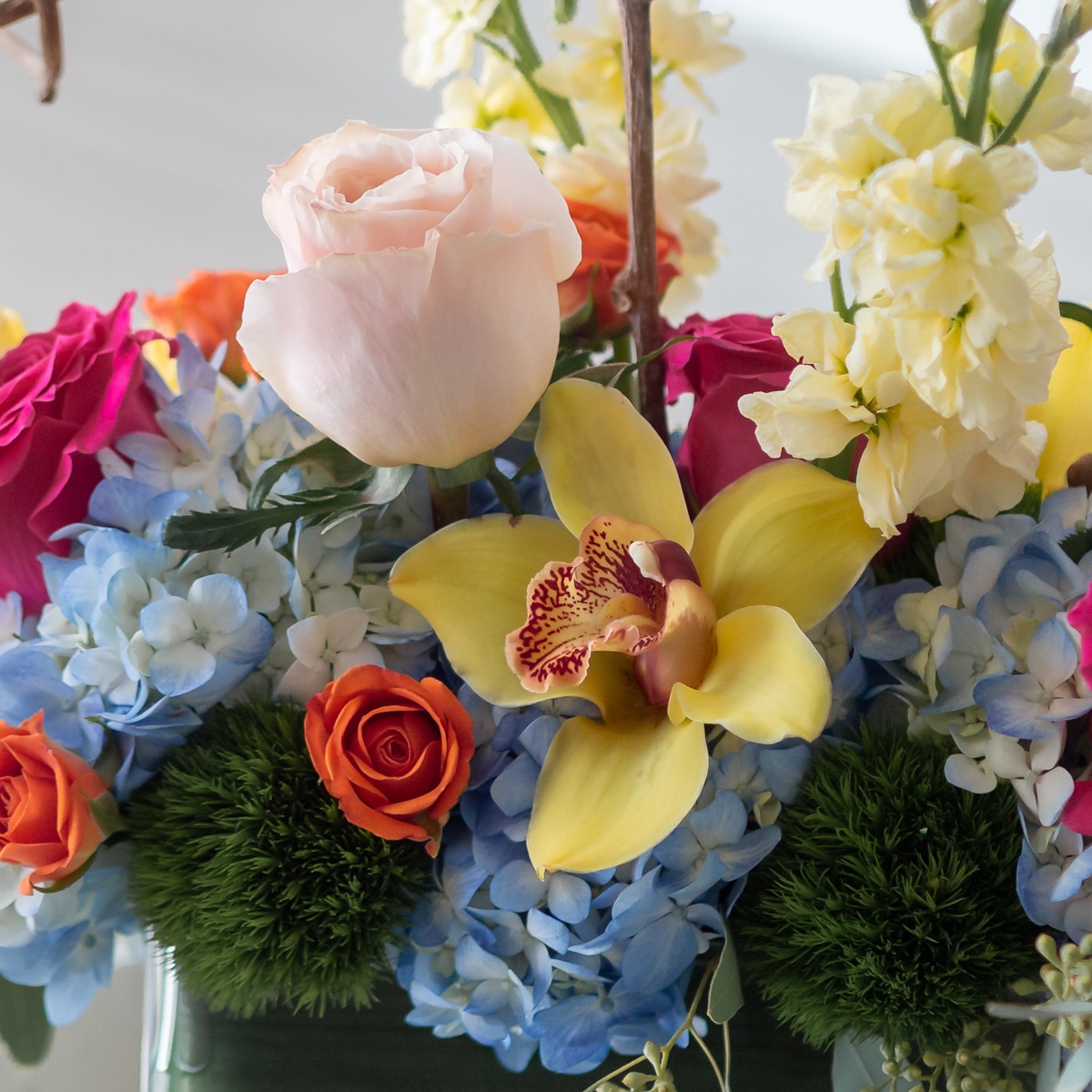 • Includes: Pink and orange roses, yellow orchids, hydrangeas, stock flowers, lush greenery, and decorative wooden branches.