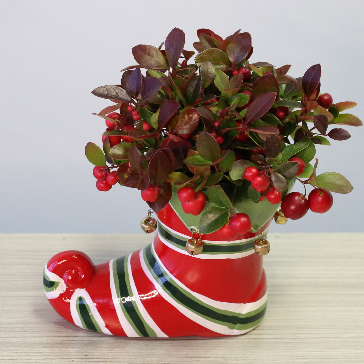 Spread holiday cheer with our charming "Elf Boot." This festive ceramic pot, designed as a whimsical red elf boot with polka dots and golden bells, holds a 4" Gaultheria (winterberry) plant. Standing 9" high, this delightful arrangement brings the joy of the season with its vibrant red berries and lush green foliage. Perfect as a unique gift or a fun addition to your Christmas décor, the Elf Boot is a playful celebration of the holiday spirit. Please note: Pot styles may vary.