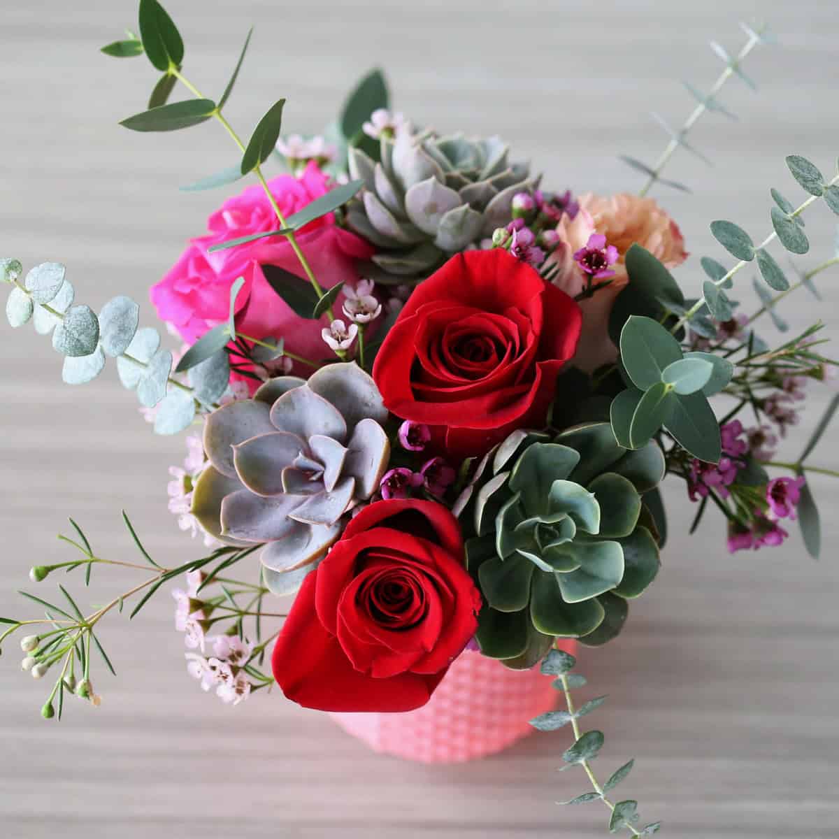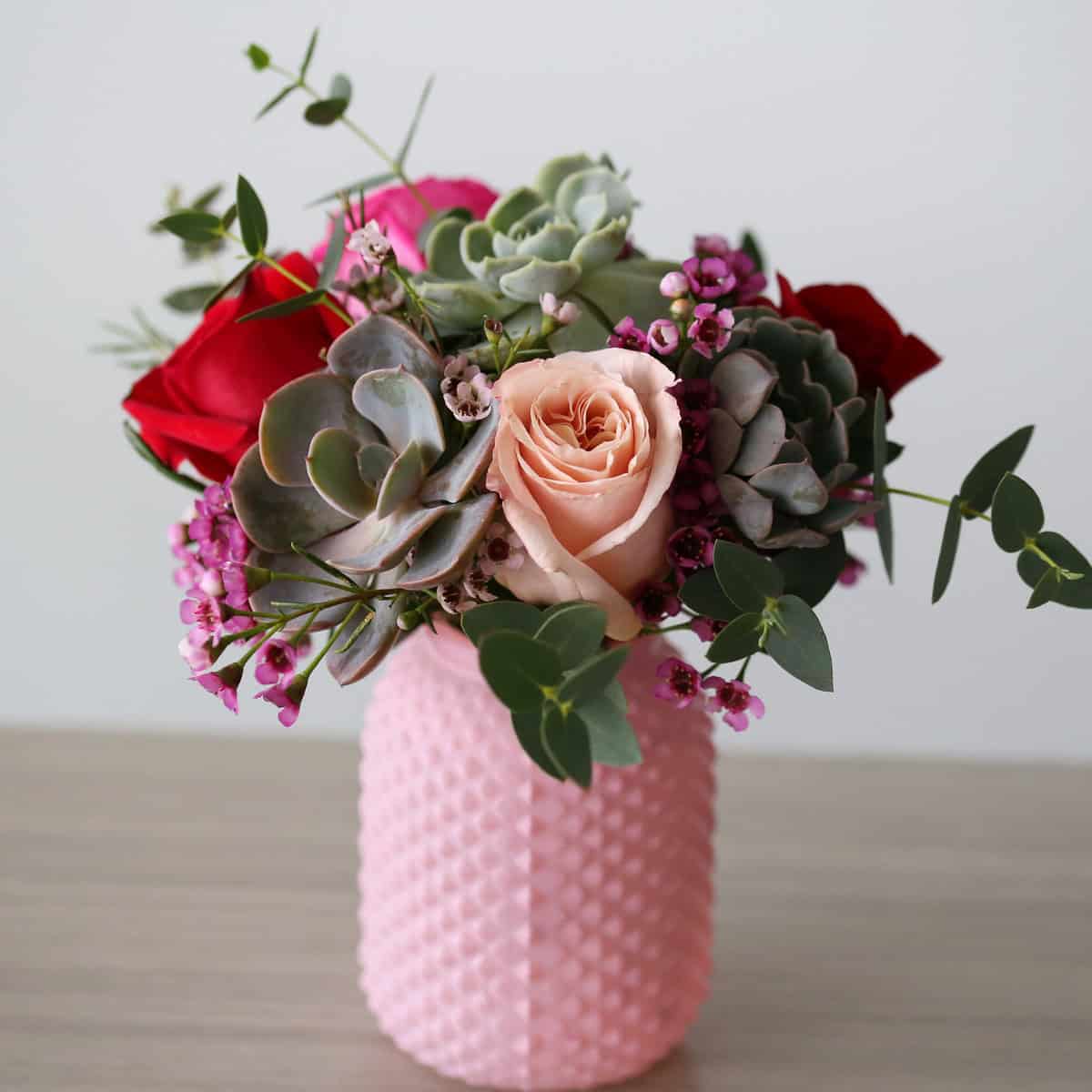 Celebrate timeless beauty with Everlasting Charm, a stunning floral arrangement that combines elegance and nature. This design features vibrant red and soft blush roses, lush greenery, delicate wax flowers, and succulents, all arranged in a charming textured pink vase.