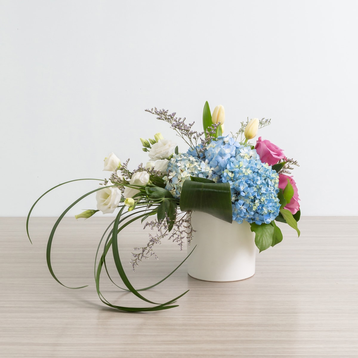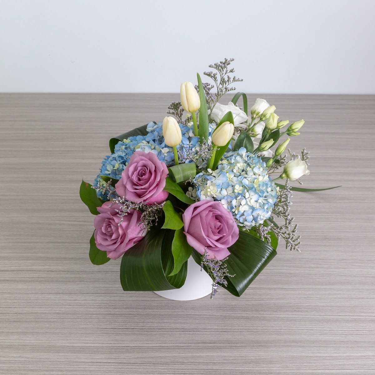 Vibrant blue hydrangeas with white lisianthus and tulips...all Canadian grown! For an extra pop of colour, choose deluxe and we will nestle in mauve Coolwater roses! In a white ceramic container. In the event that we are out of blue hydrangeas, we will substitute with white and when tulips are out of season we will substitute with additional lisianthus or freesia. If ever you would like to know what is in stock, please call us at 514-747-2581.