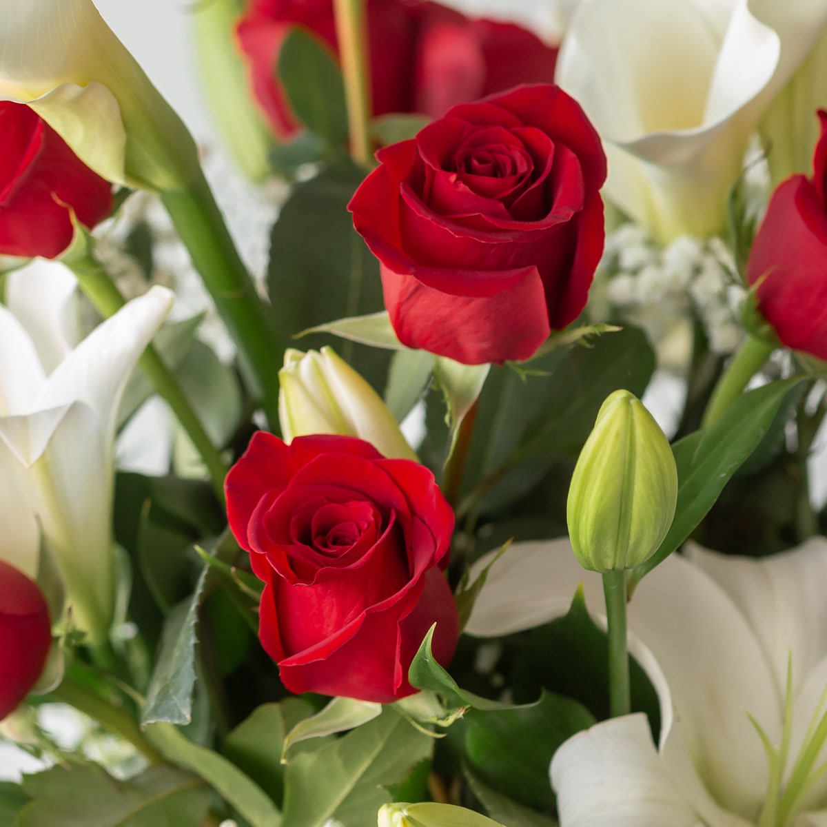 The Timeless Romance Bouquet features a stunning combination of a dozen beautiful red roses, elegant white calla lilies, white lilies, delicate gypsophila stems, eucalyptus branches, and luscious greens. With the option to choose between a bouquet alone or a bouquet presented in a vase, this exquisite arrangement adds a touch of cherishing love and elegance to any occasion. Approximately - 19"L x 26"H