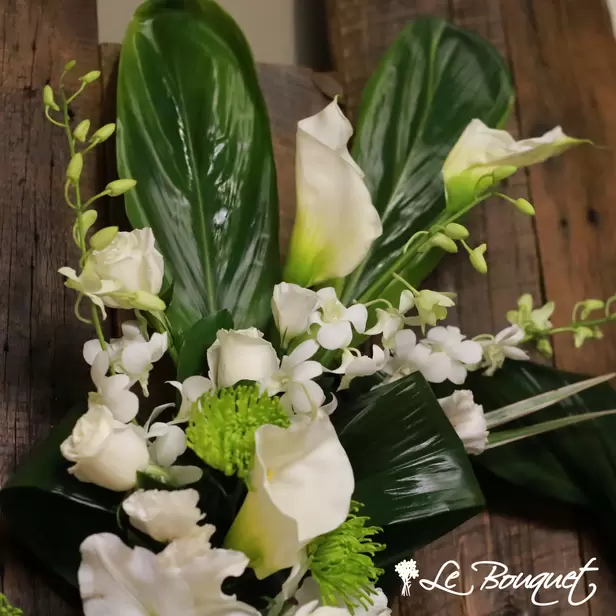 This exquisite wreath is the perfect commemorative piece to honor a loved one. The white roses, calla lilies, orchids. lilies and eucalyptus cascade gracefully from one side as assorted greenery complete the wreath.