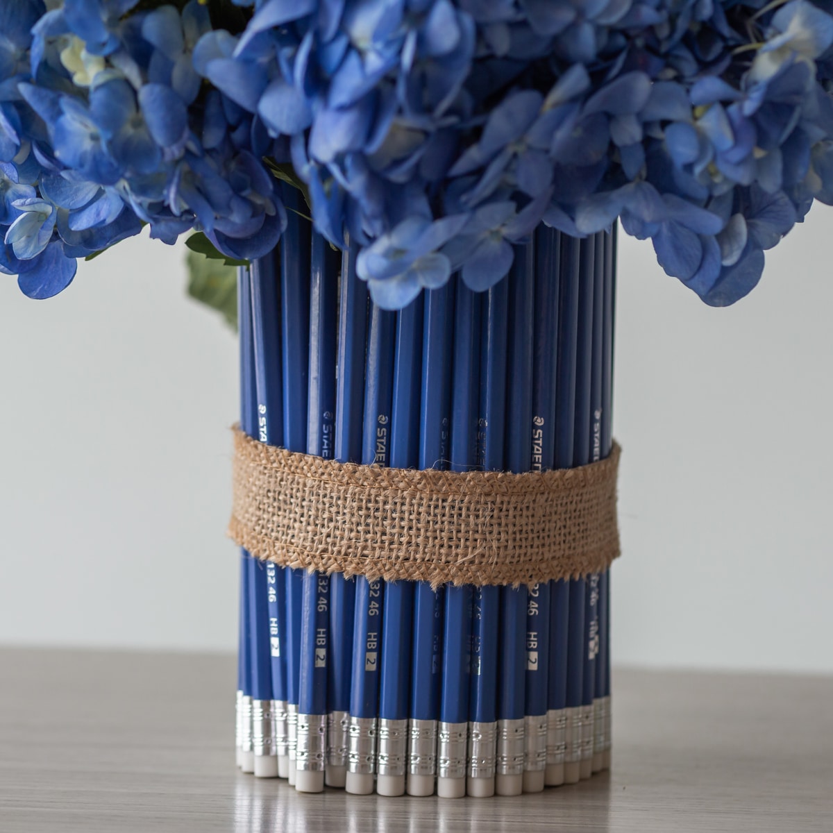 • Includes: Sunflowers, blue hydrangeas, solidago, chrysanthemums, and decorative pencils.