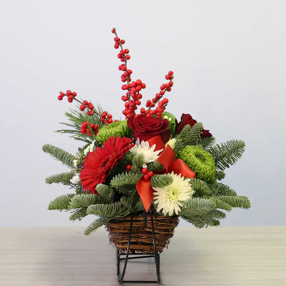 Our Sleigh Ride arrangement captures the magic of the holiday season with a charming design. Featuring vibrant red gerberas, elegant red roses, green chrysanthemums, lush greenery, and festive berries, this arrangement is presented in a rustic sleigh-shaped wicker container. Measuring 12 inches high, 10 inches wide, and 12 inches long, it’s the perfect centerpiece for holiday gatherings or a thoughtful gift. Add a touch of seasonal cheer to your home with this delightful and festive arrangement that combines elegance and holiday spirit.