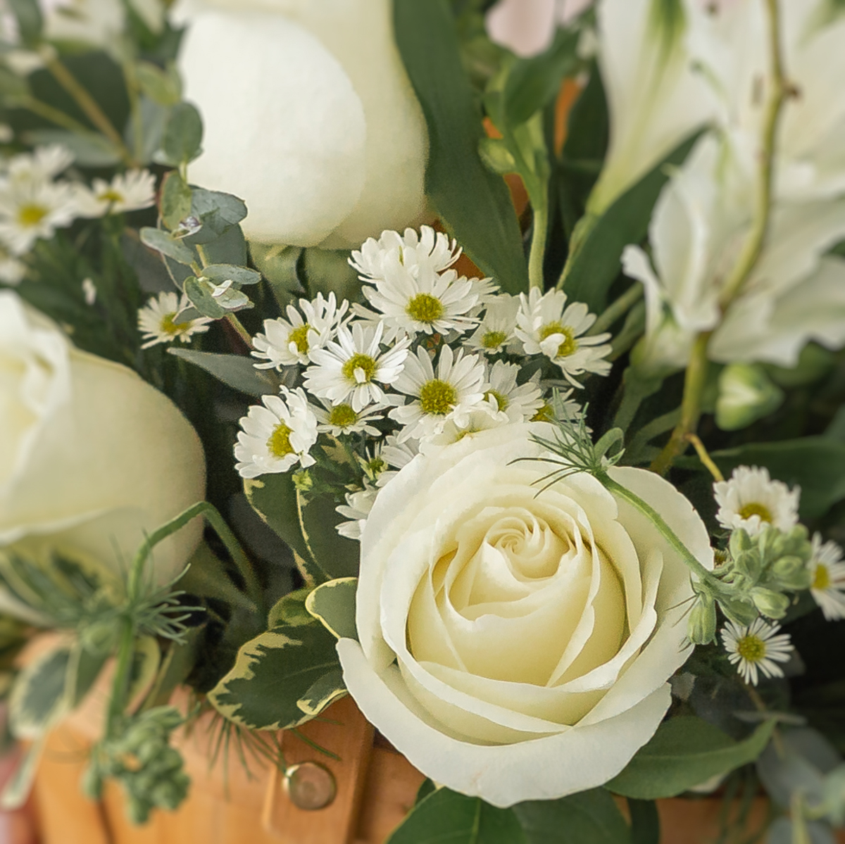 The Garden of Peace arrangement from Le Bouquet St. Laurent radiates tranquility and grace. This serene design features an elegant blend of white roses, alstroemeria, and daisies, thoughtfully arranged in a natural wooden basket. Accented with lush greenery and delicate branches, Garden of Peace embodies purity and peace, making it an ideal tribute for memorials, sympathy gestures, or serene home décor. This timeless arrangement is designed to bring comfort and calmness to any space.