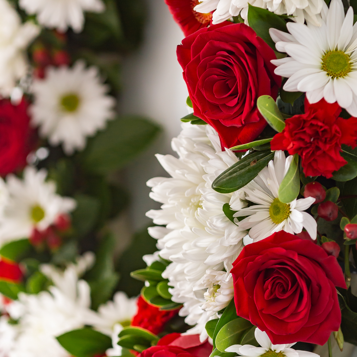 The "Treasured Tribute" funeral wreath by Le Bouquet Montreal offers a beautiful and meaningful way to honor a loved one. This wreath can be customized in several color options to suit personal preferences. Elegantly arranged with roses, carnations, daisies, and lilies in some models, this wreath radiates respect and remembrance. A heartfelt tribute for funerals, it provides a dignified display of love and admiration. Please note that a stand is required for church deliveries.