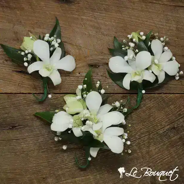 Nos boutonnières de la collection Signature Le Bouquet peuvent être personnalisées à votre goût facilement. Faites vos choix d'options de couleur, de taille et de garnitures ci-bas.