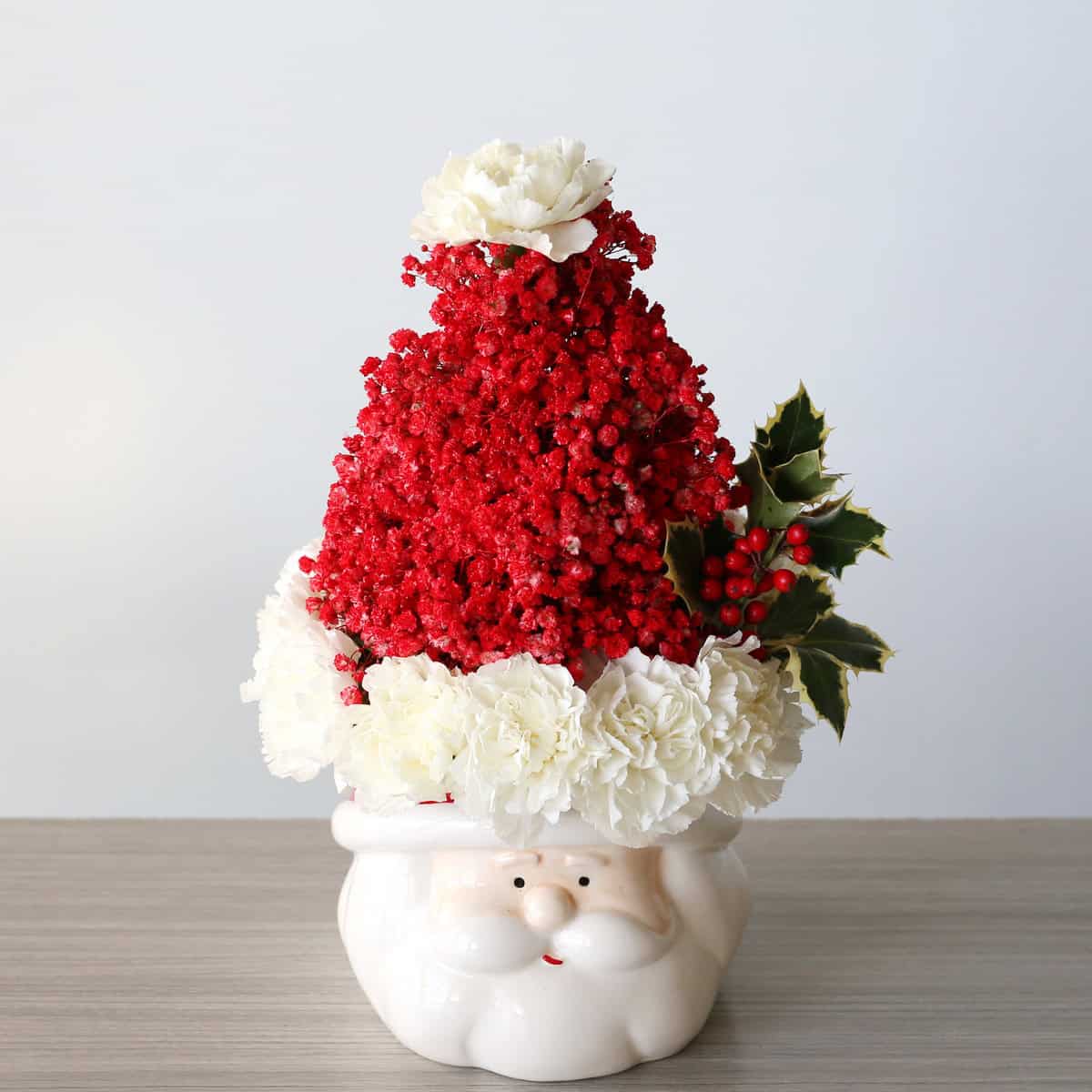 Célébrez la saison des fêtes avec notre "Centre de table du Père Noël", un ajout charmant à votre décor festif. Présenté dans un contenant en céramique en forme de Père Noël, cet arrangement combine un souffle de bébé teinté et des œillets blancs, pour une touche festive et joyeuse. Mesurant 13,5" de hauteur sur 9" de largeur, ce centre de table est idéal pour votre table de fête, votre cheminée ou comme cadeau original.