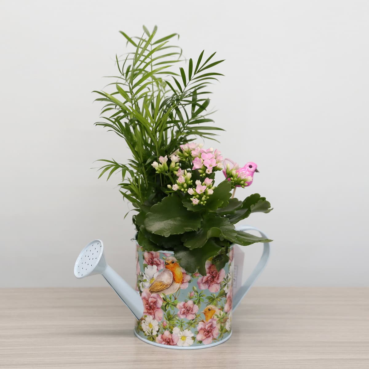 La Jardinière Arrosoir Airy est une ode florale au printemps. Présentée dans un charmant arrosoir en métal au style vintage, orné de fleurs pastel et d’oiseaux délicats, elle contient un bel arrangement de kalanchoé fleuris et de verdure luxuriante.