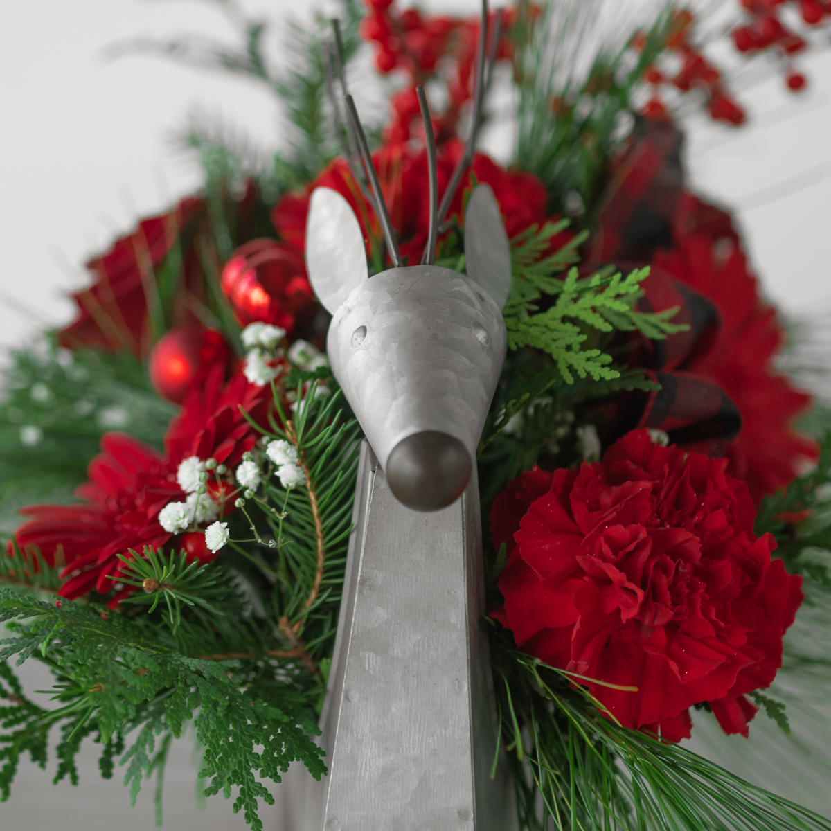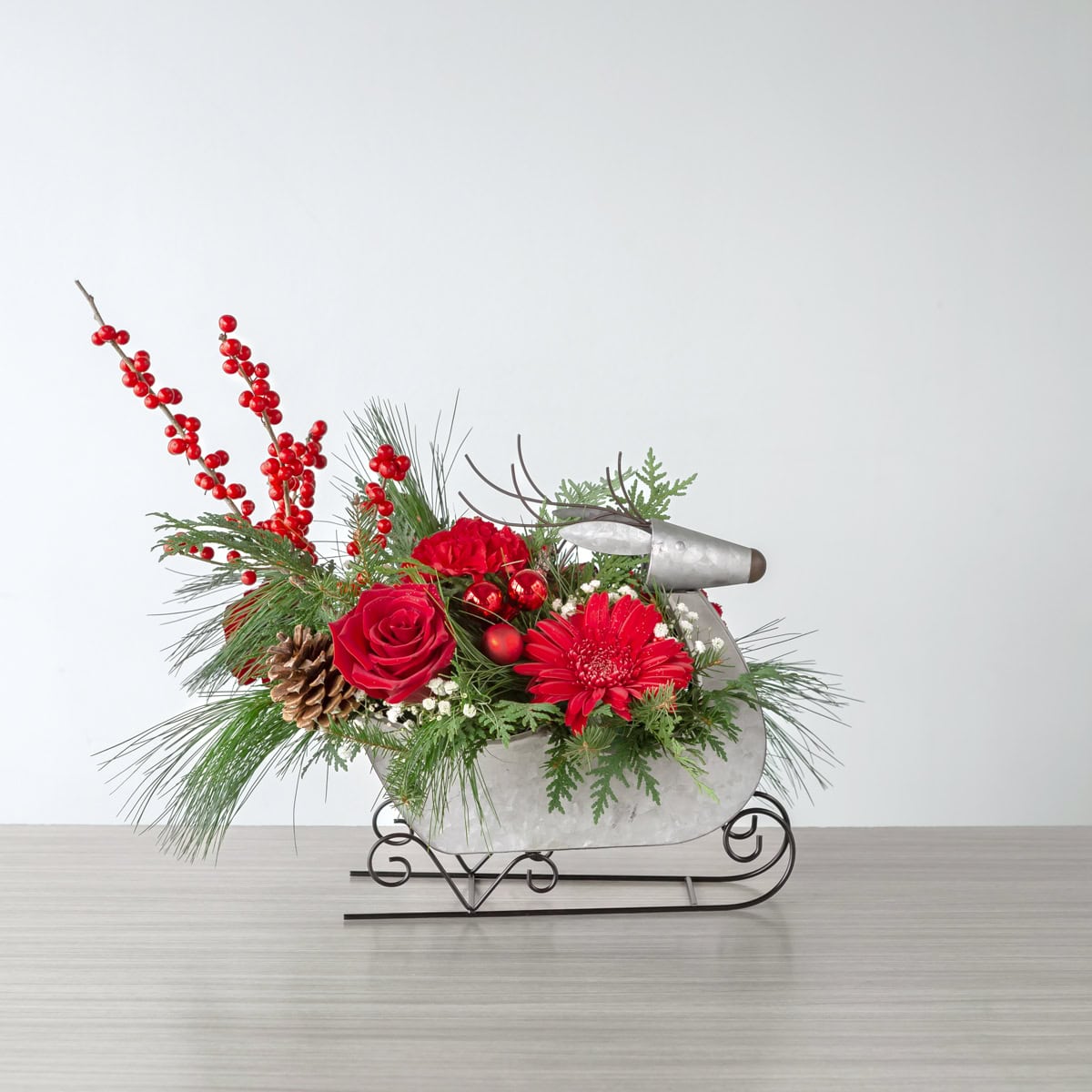 Célébrez les Fêtes avec le charme de Tornade, un arrangement enchanteur présenté dans un traîneau en métal rustique pour une touche festive. Ce design joyeux met en valeur de magnifiques roses rouges, des œillets rouges vibrants et des gerberas éclatants, agrémentés de verdure saisonnière luxuriante, de pommes de pin et de baies rouges festives. Le traîneau ludique ajoute une note nostalgique et amusante, en faisant la pièce maîtresse ou le cadeau parfait pour illuminer n’importe quel espace durant les Fêtes.